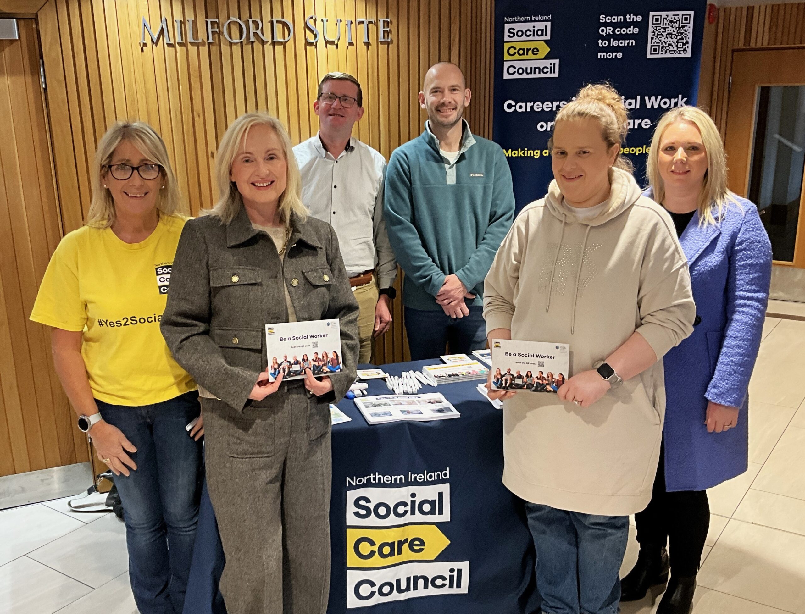 At today’s NISCA Conference, the Social Care Council met with careers teachers from across Northern Ireland, as we launch our letter encouraging students to consider a future in social work. Pictured from left to right: Alison Shaw, Workforce Development Officer, Social Care Council, Tricia Devlin, Interim Co-Head of Workforce Development, Social Care Council, Gerard McWilliams, member of the Social Care Council’s Participation Partnership, Barry McManus, Head of Careers, St Ciaran’s College, Ballygawley, Wendy Botha, Head of Careers, Integrated College, Dungannon and Una McSorley, Head of Careers, Holy Trinity College, Cookstown.